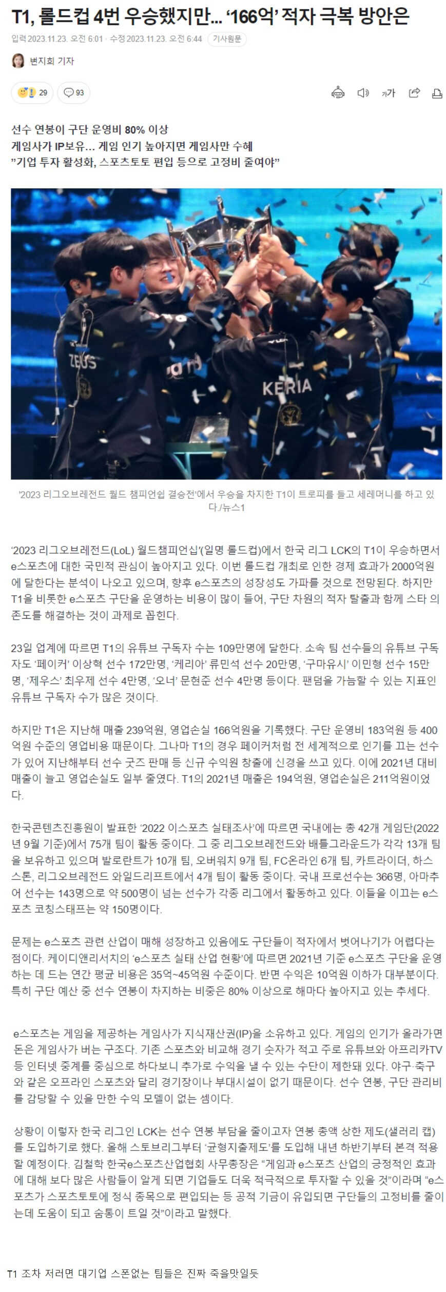 T1, 롤드컵 4번 우승했지만… ‘166억’ 적자 …